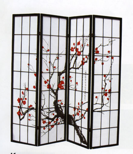 Ширма экран «Сакура» Артикул: СуПл021 Ширма высокая, 4-х секционная.  Материал: темное дерево и "рисовая бумага" (плотная волокнистая ткань).  Традиционный японский рисунок - цветущая сакура. С лицевой стороны полотно рисовой бумаги разделено тонкими деревянными планками на крупные прямоугольники.  Размер: (45х180см)х4 секции.